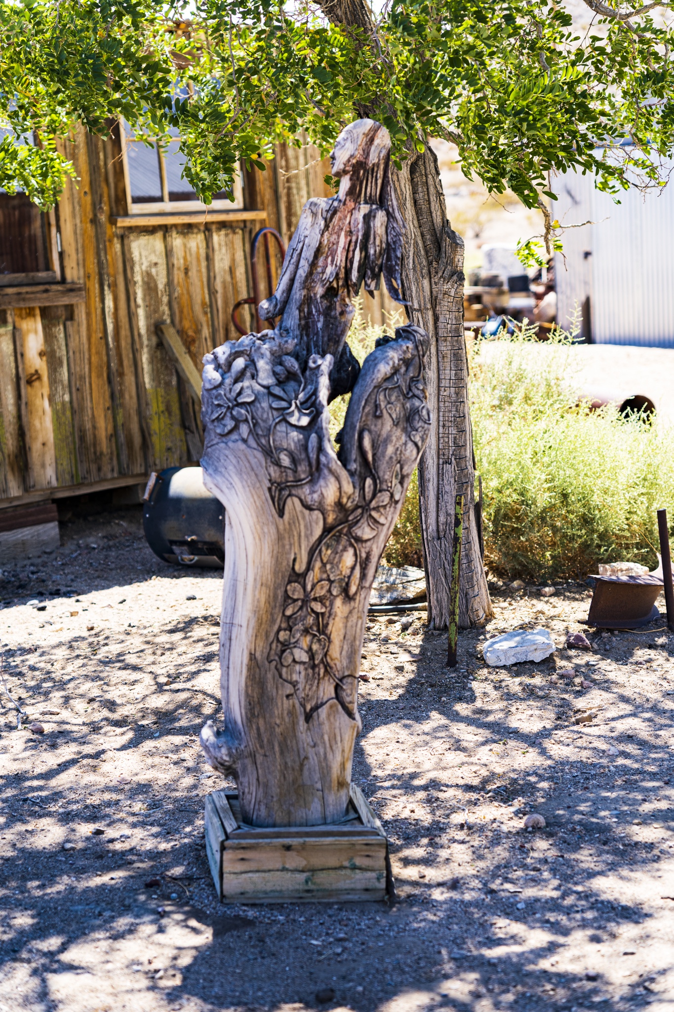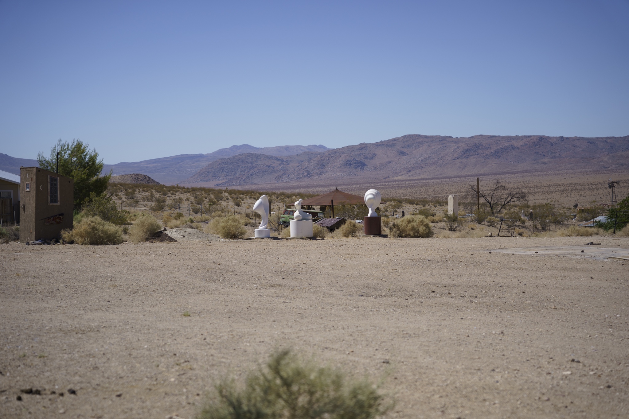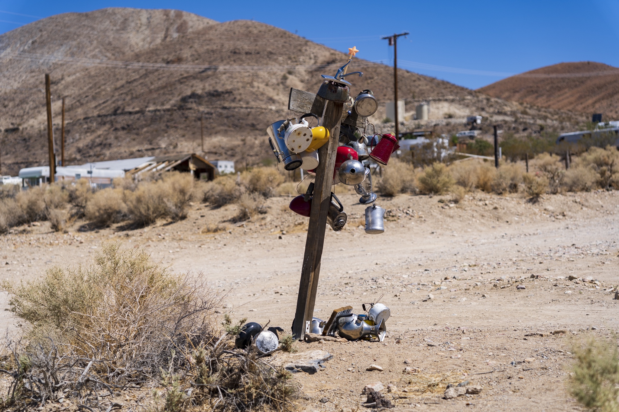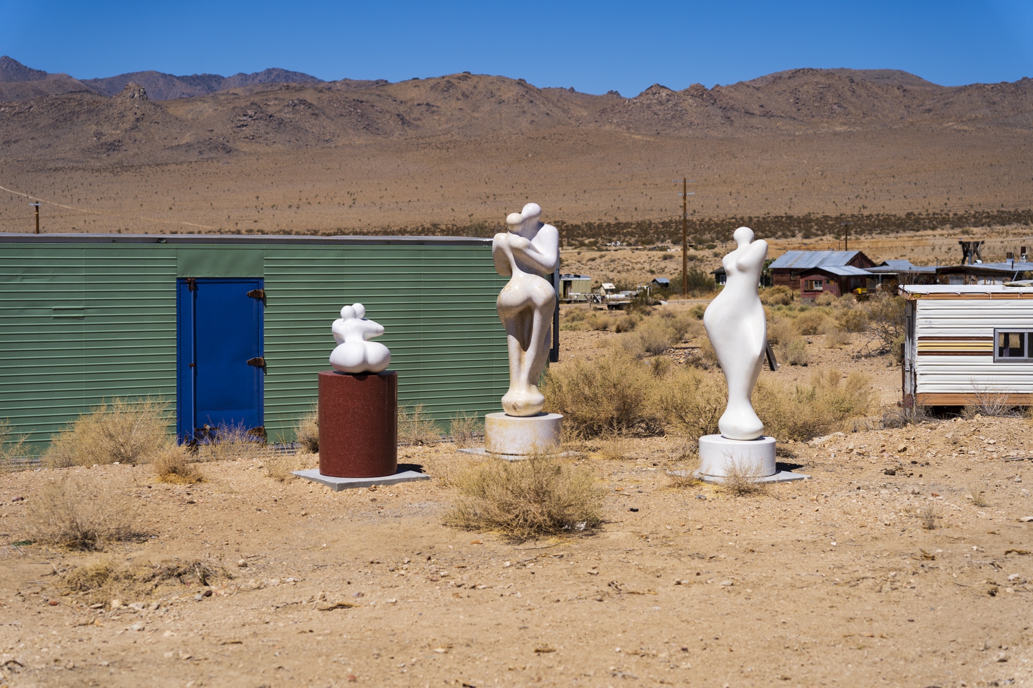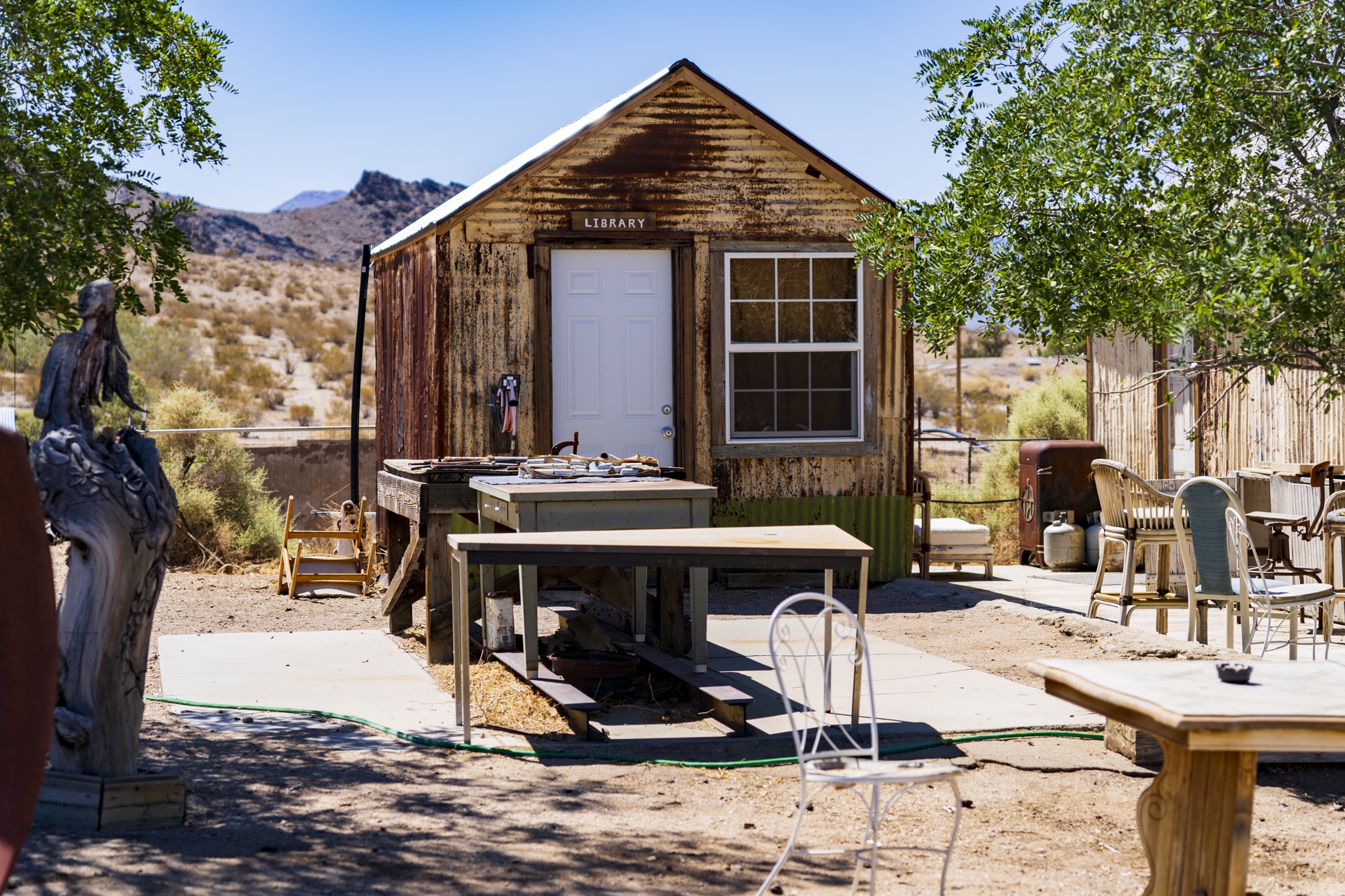 I would describe Darwin as being in a partial state of arrested decay, as you can tell from my photos below. I really liked the old vehicles as well as the gas pump and rusted adding machine. The post with all of the tea kettles was odd, and was right in front of a family’s home. We could tell the dance hall is still actively used (pink building) . There were a few people out doing things on their properties while we were there. Amongst the strange things we saw was the very weathered wood statue carving as well as multiple white marble statues of naked women and men. These were hand-carved by a resident at the town because we happened by his home and could see many blank marble block slabs (for future projects) as well as a large statue carving in progress complete with a ton of fresh white marble shavings piled up around it. These were interesting to look at, but also seemed very odd and out of place. Also, a lot of furniture left outside to weather under the hot sun. Not sure if these get used by the residents, or are there to invite people to gather, not really sure. The Library was in such a tiny shack of a building. Really, the town seemed very quiet and mostly deserted. I don’t see the point of wanting to live here unless you want to be left alone and off the grid. Obviously no internet, and cell service was not good signal. Whatever you might need, you would always have to drive further back to a larger town to get it. It seemed for several of the properties there, each one had its own theme of recycled/manufactured art or collection, if you will. The mine is still there, set up into the large hill, along with a large grouping of what used to be individual worker residences. These may have possibly ok way back in the day, but these had very thin walls, no insulation and very small. Better than nothing I suppose but not very good either. The whole mining property was gated and locked up, so no change to hike around to get a better view. Obviously that’s done to keep people out and nobody getting hurt.