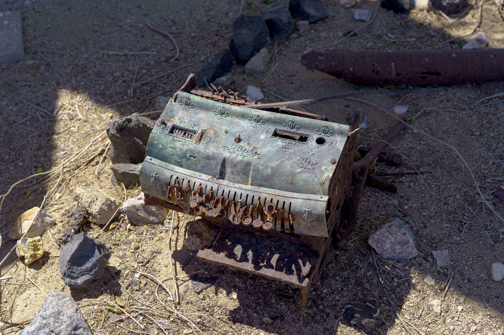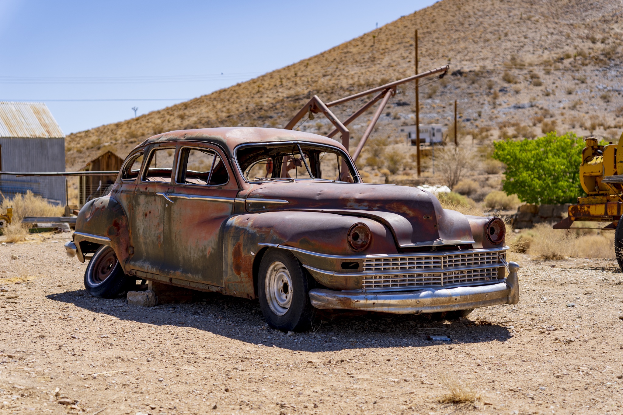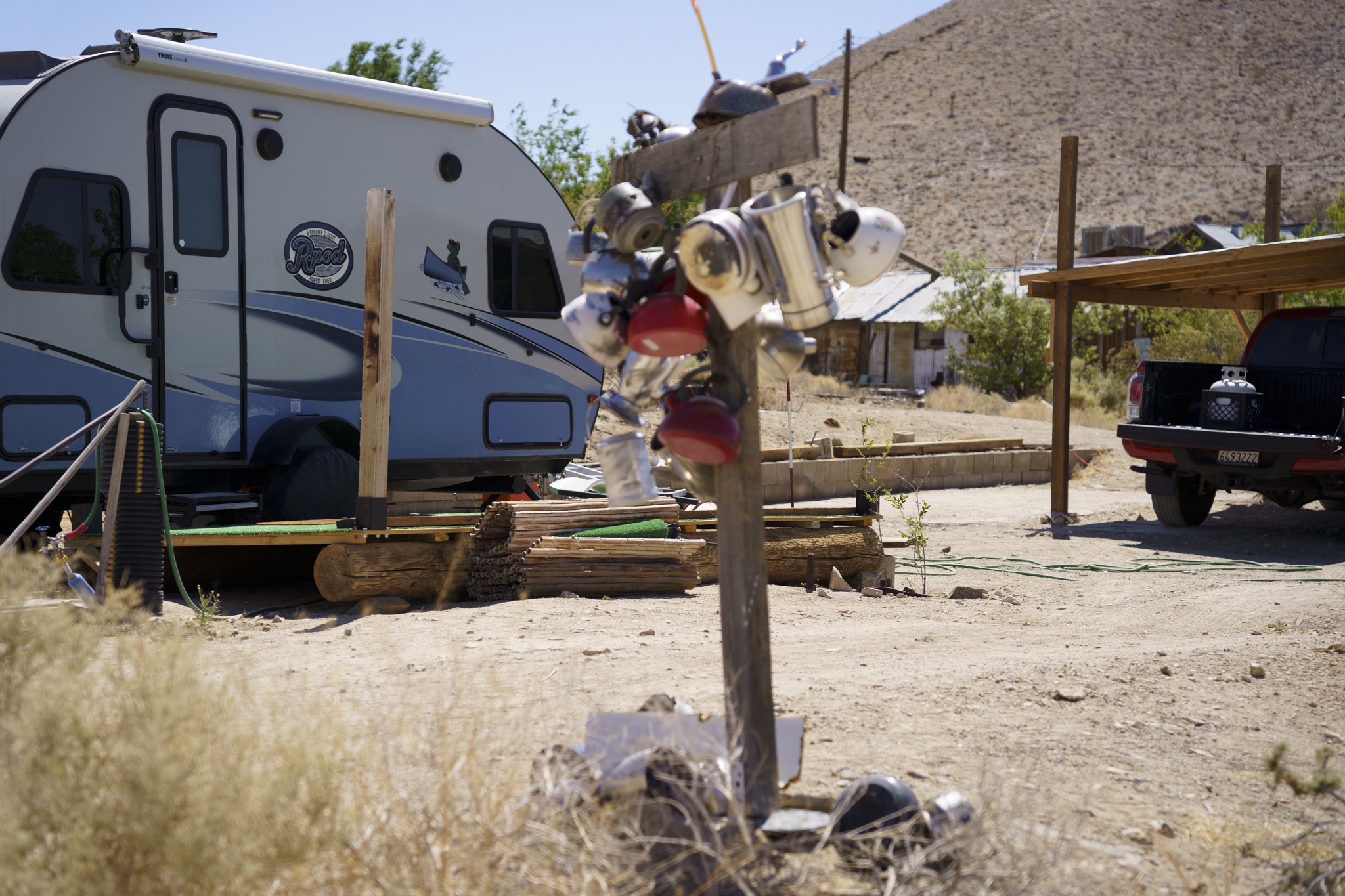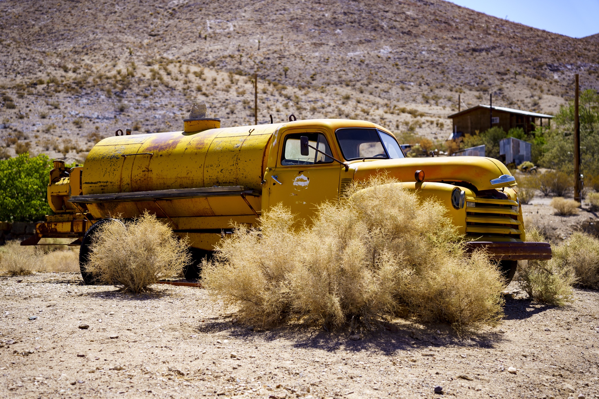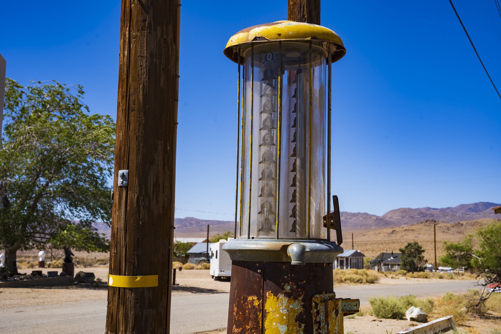 I would describe Darwin as being in a partial state of arrested decay, as you can tell from my photos below. I really liked the old vehicles as well as the gas pump and rusted adding machine. The post with all of the tea kettles was odd, and was right in front of a family’s home. We could tell the dance hall is still actively used (pink building) . There were a few people out doing things on their properties while we were there. Amongst the strange things we saw was the very weathered wood statue carving as well as multiple white marble statues of naked women and men. These were hand-carved by a resident at the town because we happened by his home and could see many blank marble block slabs (for future projects) as well as a large statue carving in progress complete with a ton of fresh white marble shavings piled up around it. These were interesting to look at, but also seemed very odd and out of place. Also, a lot of furniture left outside to weather under the hot sun. Not sure if these get used by the residents, or are there to invite people to gather, not really sure. The Library was in such a tiny shack of a building. Really, the town seemed very quiet and mostly deserted. I don’t see the point of wanting to live here unless you want to be left alone and off the grid. Obviously no internet, and cell service was not good signal. Whatever you might need, you would always have to drive further back to a larger town to get it. It seemed for several of the properties there, each one had its own theme of recycled/manufactured art or collection, if you will. The mine is still there, set up into the large hill, along with a large grouping of what used to be individual worker residences. These may have possibly ok way back in the day, but these had very thin walls, no insulation and very small. Better than nothing I suppose but not very good either. The whole mining property was gated and locked up, so no change to hike around to get a better view. Obviously that’s done to keep people out and nobody getting hurt.